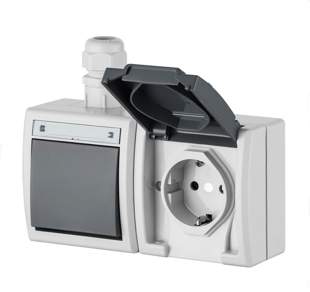 Pārslēdzis vienp + kontaktligzda. horizontāls. v/a. 16A - 250V. IP 65. AQUANT IP 55. balts/pelēks
