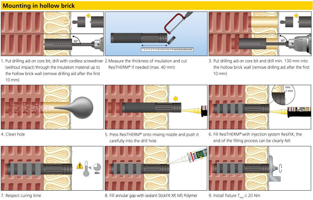 The Apolo MEA ResiTHERM is the perfect solution for installations in hollow bricks. It is a heavy-duty system for fastening of awnings, canopies, French balconies, railings, satellite dishes etc. Almost no thermal bridge due to a robust glass fibrereinforced nylon body. The 80 mm deep internal thread allows a perfect thermal separation as well as a big insertion depth of the threaded stud. Threaded stud, nut and washer out of stainless steel A4 for optimal corrosion resistance. Special membrane for an evenly distribution of the injection resin (tailored to ResiFIX VY) for high application safety. Massive anchor body made out of glass fibre-reinforced and ageing resistant high quality nylon ensures long-term security. Comfortable injection of the resin ResiFIX from outside. The mixing nozzle sticks in the injection hole, this makes it easier to adjust the protrusion to the plaster. Large application range due the metric thread M12 M12 is the most common thread size for awnings, canopies, French balconies, etc. Product is ready to use: Available in four standard lengths S, 120, 160, 200 for the most common insulation thicknesses.