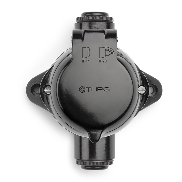 kautta. 2 pystysuuntaista asettelua kahdella poistoaukolla. Kaksiosainen kotelo ja kansi, valmistettu bakeliitista, ei-vierekkäin sisääntuloilla ja ulostuloilla. Kaksi sivuttaista ruuvikiinnitystä helpottavat seinälle kiinnittämistä. Sisäänrakennettu lastensuojain. Jousipidikkeillä. Kaapeli asennetaan seinäpintaan. Turvallisuusluokka IP44 suljetulla kannella, luokitus IP20, kun pistoke on asetettu paikalleen. Jokaisessa pistorasiassa on ylimääräinen kumirengas: jos se kiinnitetään IP44-liittimeen lisätiivisteenä, pistorasia saavuttaa turvallisuusluokituksen IP44.