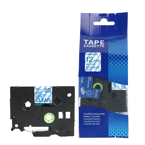 Matēta laminēta uzlīmju lente. 12mm. zils uz matēta caurspīdīga. Matt Paper (analoga)