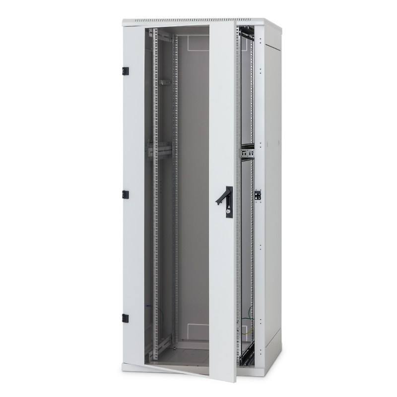 The welded free standing cabinet with maximal load 400 kg, made from steel, IP 20. Ventilation slots on the side of cabinet roof and bottom. Cable entries and fan units openings with breakout-type blanking panels in the top and bottom part of the cabinet. All parts grounded, central earthing point preinstalled.Two pairs (from the cabinet depth 900 mm three pairs) 19“ vertical mounting rails, galvanized, adjustable. All installation units marked on the mounting rails and numbered in the both directions (up and down).