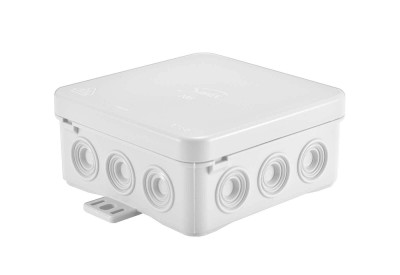 Sanduku la makutano 88x88x55mm. kifuniko kinachoweza kushinikizwa. na pembejeo 7. IP54. kijivu