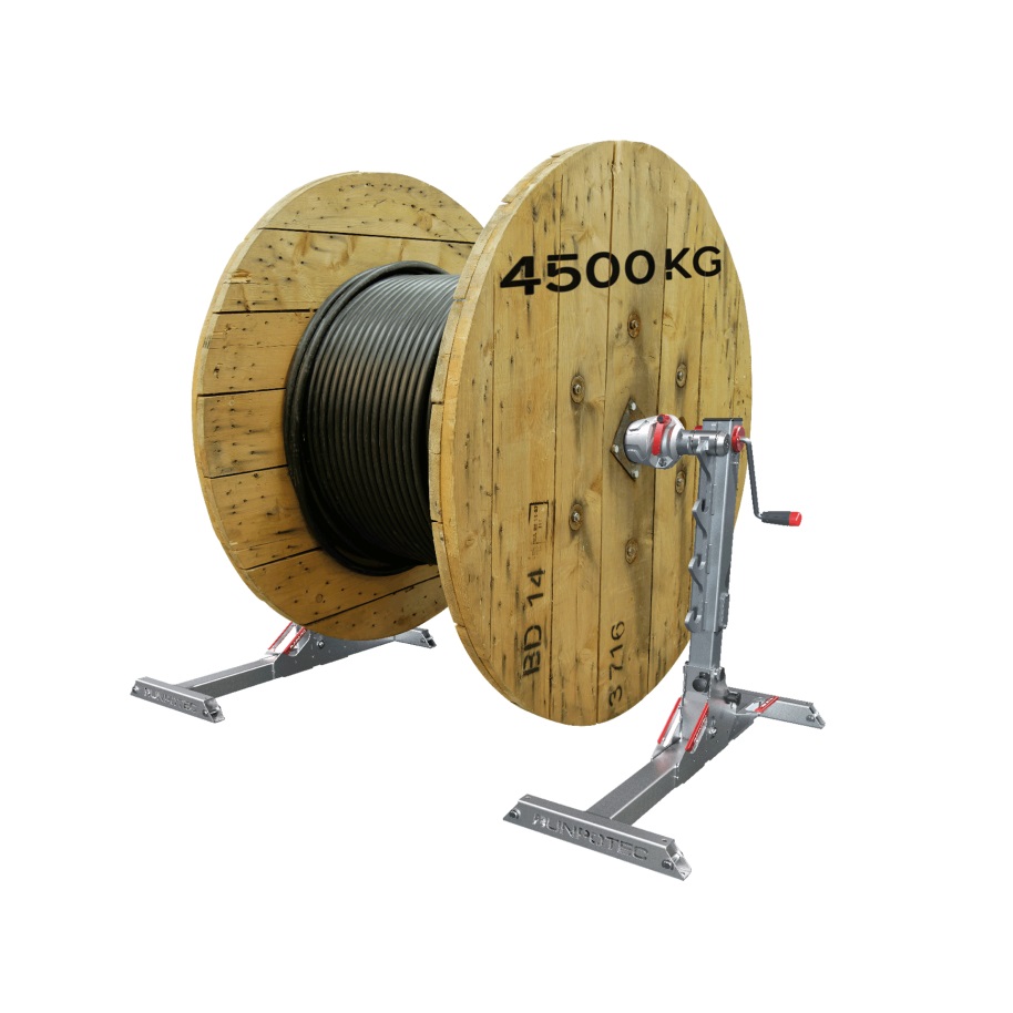 The RUNPOLIFTER 4500 is a foldable cable drum lifter that is capable of lifting drums with a maximum diameter of 1600 mm and a maximum weight of 4500 kg. Its lightweight construction (22 kg per lifting support) means it can be easily transported, yet it still maintains excellent standing properties on a wide variety of floor coverings. The two lifting supports are equipped with a 2-stage gearbox. The fast gear is used for the idle stroke and the working gear is used for the load stroke. Switching between the two gears can be controlled by pulling out the crank. When using the RUNPOLIFTER 4500, it is not necessary to pin the raised load because the gearbox is equipped with a self-locking spindle. The included drum shaft features two plain bearings that enable the respective drum to be rolled comfortably without any trouble. The 1350 mm drum shaft is included. The following lengths are also available: 1150 mm or 1600 mm. The two included centring cones each have a quick-release fastener that enable the drum to be fixed quickly and centrally in place. Drums with a max. inner diameter of Ø 110 mm can be secured here.Optimum area of application: for lifting and then rolling cable drums with a diameter of up to 1600 mm, a wide of 1000 mm and a max. weight of 4500 kgApplication video: a short, very informative application video can be viewed by scanning the QR code or on www.RUNPOTEC.com.