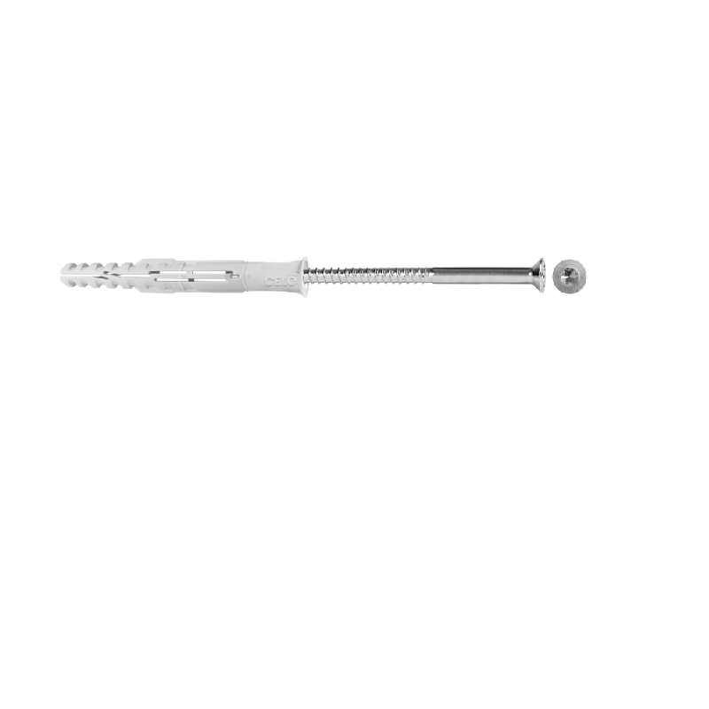 The CELO multifunction frame connector MFR is available in diameters of 8, 10 and 14 mm with different screw materials and head types. MFR is ETA approved together with CELO safety screw made of galvanized and stainless steel. The MFR multifunction frame plug allows universal mounting of façade bases as well as wooden and metal parts in all common basic materials. The long expansion area and the early expansion achieved by the side bars ensure reliable and secure holding. All lengths up to 160 mm are pre-assembled, which reduces storage costs and saves time on site. Uniform setting depth makes it easy to install plugs of different lengths. The plug is made of high quality and aging-resistant nylon. The flat arc version prevents corrosion of metal parts.