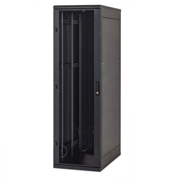 The welded free standing cabinet with maximal load 400 kg, made from steel, IP 20. Ventilation slots on the side of cabinet roof and bottom. Cable entries and fan units openings with breakout-type blanking panels in the top and bottom part of the cabinet. All parts grounded, central earthing point preinstalled.Two pairs (from the cabinet depth 900 mm three pairs) 19“ vertical mounting rails, galvanized, adjustable. All installation units marked on the mounting rails and numbered in the both directions (up and down).