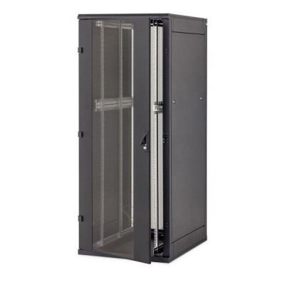 The welded free standing cabinet with maximal load 400 kg, made from steel, IP 20. Ventilation slots on the side of cabinet roof and bottom. Cable entries and fan units openings with breakout-type blanking panels in the top and bottom part of the cabinet. All parts grounded, central earthing point preinstalled.Two pairs (from the cabinet depth 900 mm three pairs) 19“ vertical mounting rails, galvanized, adjustable. All installation units marked on the mounting rails and numbered in the both directions (up and down).