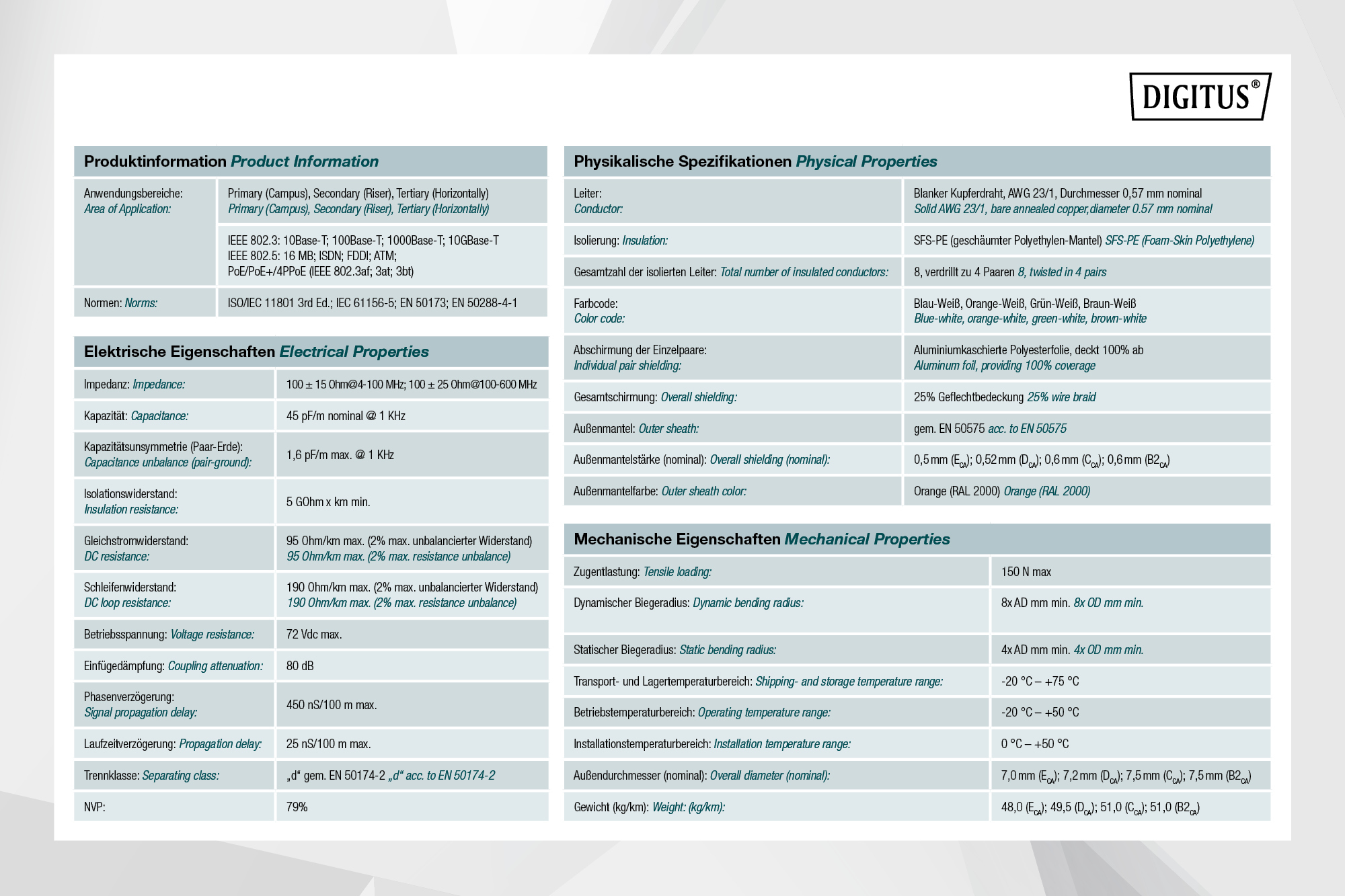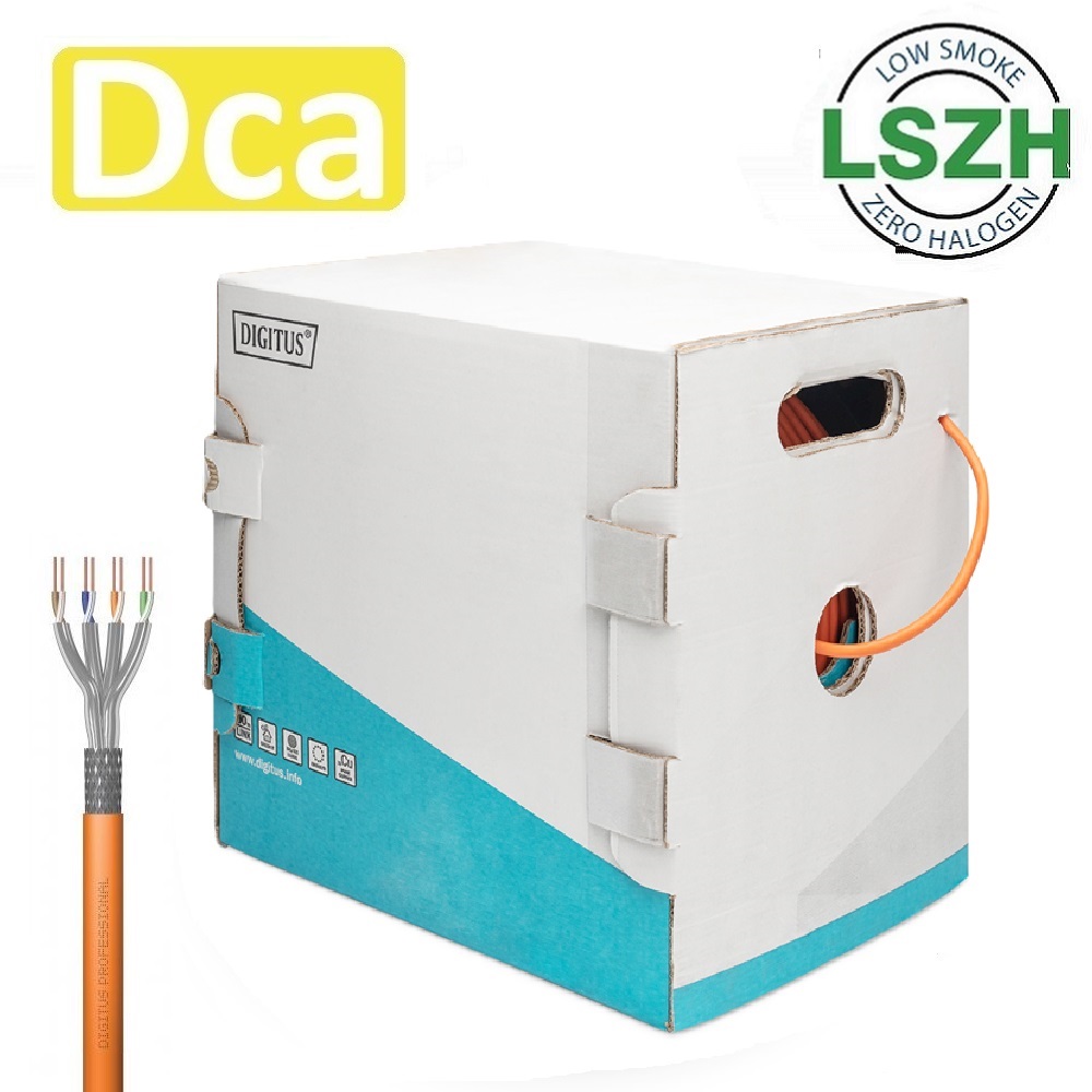 CAT 7 S-FTP Installationskabel, 1200 MHz Dca (EN 50575), AWG 23/1, 250 m drum, SX, orange Technical details Assortment: Twisted Pair Installation Cables Category: CAT 7 Shielding: S-FTP, pairs in metal foil and braid shielding CPR: Dca Length: 250 m Color: orange Jacket: LSOH Structure: 4 x 2 AWG 23/1, solid twisted pair