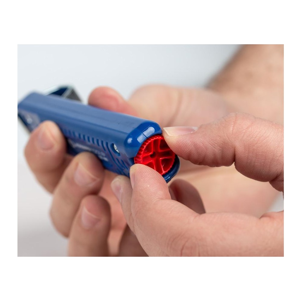 Designed for the fast and precise removal of round cable jackets 8 to 28 mm in diameter. This round cable stripper features the following: