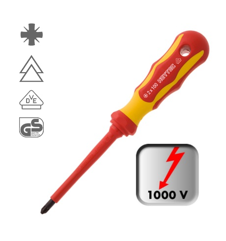 With ergonomic 2 components soft grip plastic handle, complying with IEC 60900 : 2004/VDE 006282 part 201 (DIN 7437 and DIN 7438 PZ), blades from chrome vanadum steel, hardened, with black tip, insulation of blade and handle injection moulded as one unit