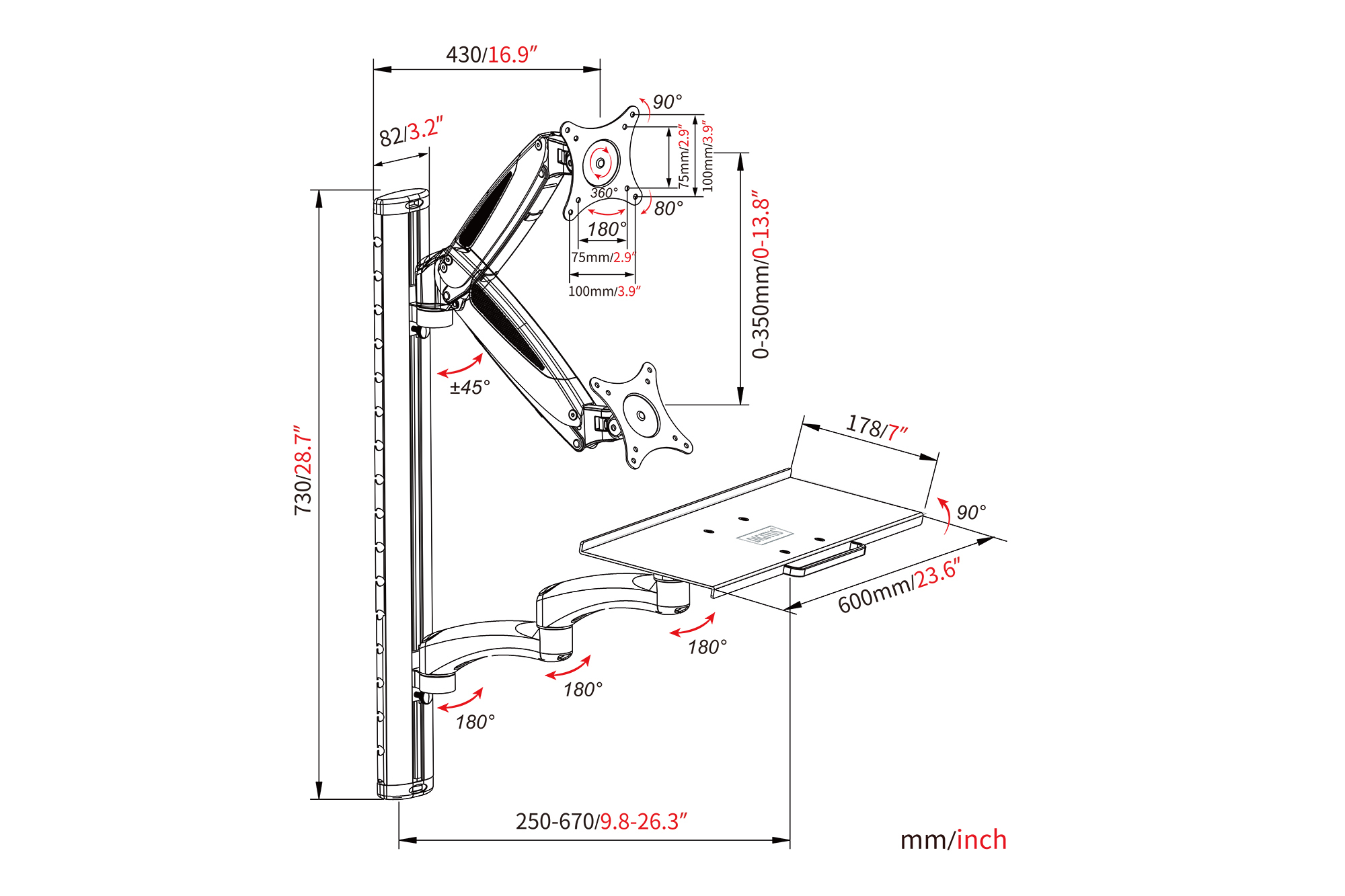 Workstation (Monitor, Keyboard, Mouse) Wall Mount 32 inch, 8 kg, VESA 75x75/100x100, white/black
