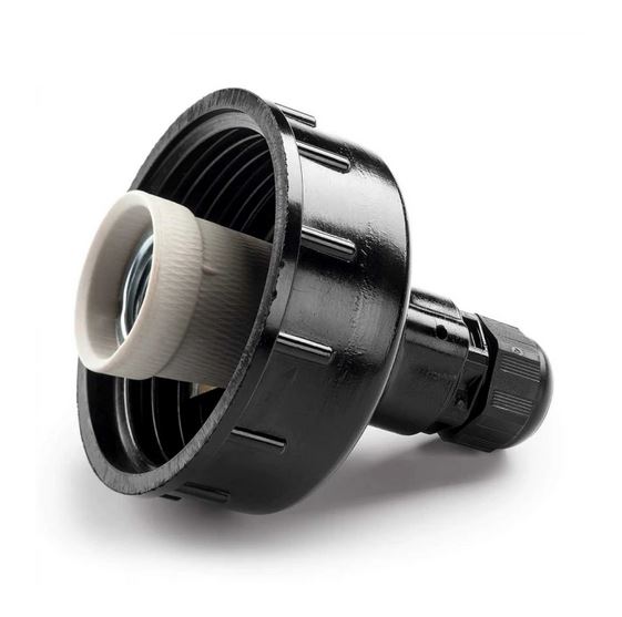 Our large Bakelite® lamp with porcelain socket (E27, 60 W) was designed more than fifty years ago for factory floors and construction sites. Its visually pleasing and confidenceinspiring shade holder weighs only 150 grams. We ship this lamp, which can also be used in kitchens, living rooms, workshops and basements, with a 1.50 meter fabric cable. Screw and cord grip are fitted with a rubber seal. Depending on your requirements, the lamp also includes a structured cylindrical pressed-glass or hand-blown lamp shade made of opal glass, which we offer in four different shapes. In addition, the light can be combined with any of the porcelain canopies and any of our various fabric cables.