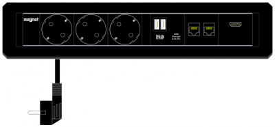 Sisäänrakennettu pistoke Magnat-Frame. 3x 230V. 1x HDMI. 2x USB A 5V/2.1A. 2x RJ45. 3m kaapeli. musta