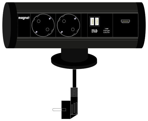 Socket Magnat-Tube. 2x 230V. 1x HDMI. 2x USB A 5V/2.1A. 3m kaapeli. musta