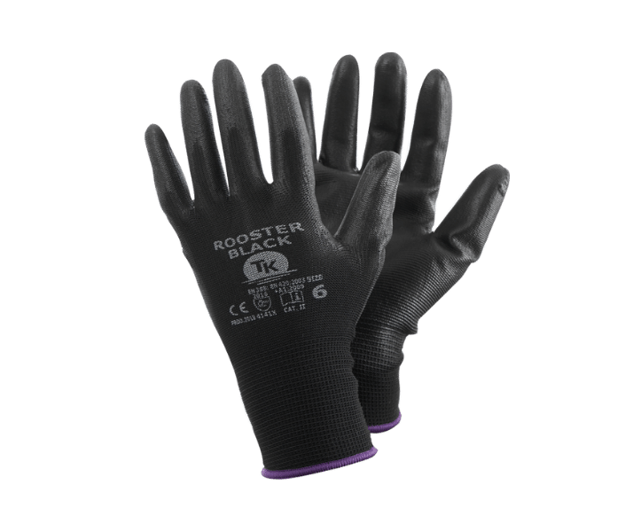 ROOSTER BLACK – защитные перчатки с полиуретановым покрытием,@2тонкая, гибкая и подогнанная вручную вставка из полиэстера,@2покрытая полиуретаном,@2неплотное ребристое запястье,@2размеры: 6, 7, 8, 9, 10, 11,@2предназначены для сборки работа, деревообрабатывающая промышленность, работа, требующая высокой точности,@2CE, EN 21420:2020, EN 388:2016+A1:2018 (3131X),