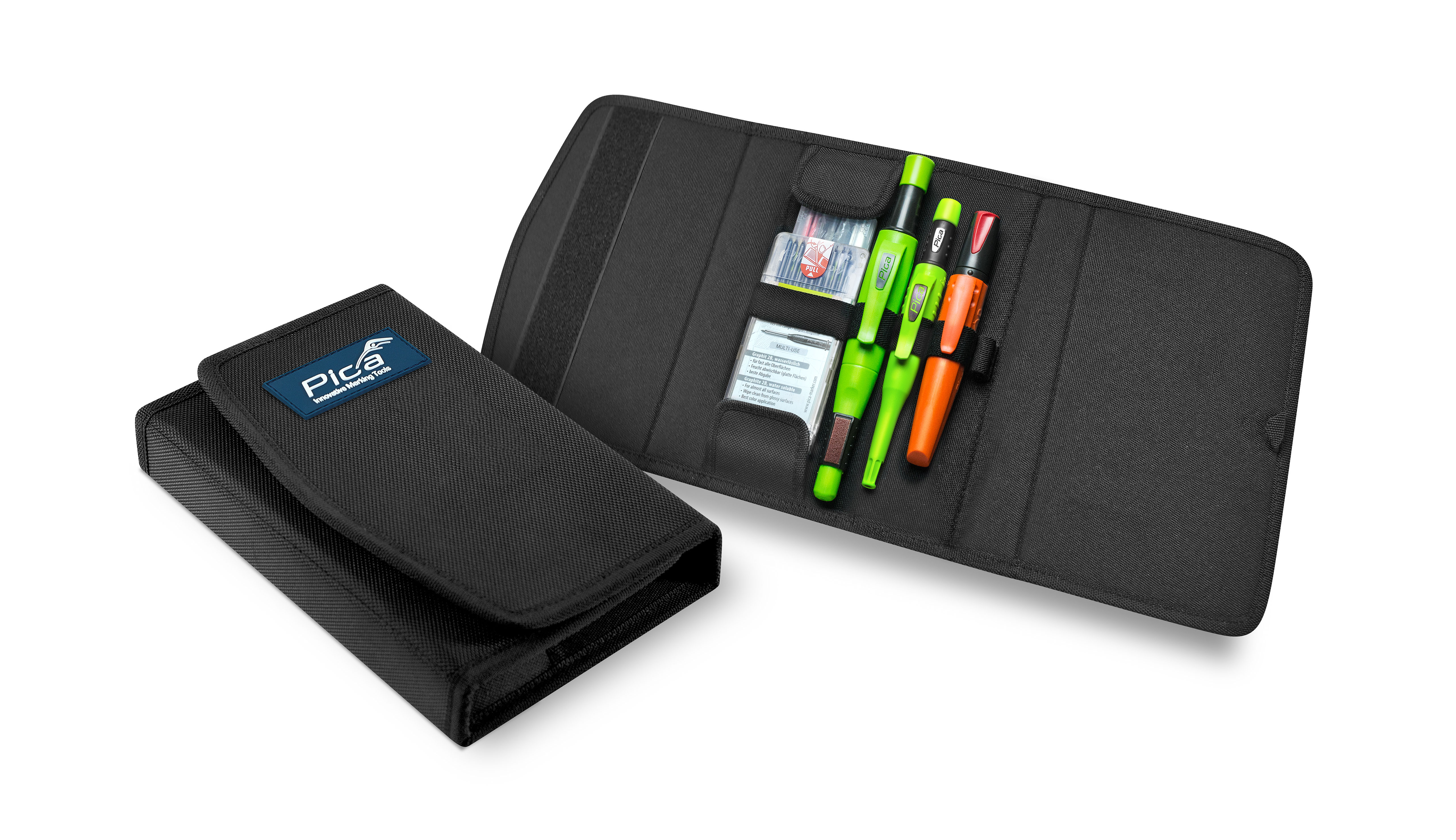Vērtīgs un praktisks marķēšanas komplekts. Saturs ir lieliski piemērots tādiem amatiem kā galdnieki, jumiķi, santehniķi, akmeņkaļi, mūrnieki un daudziem citiem. Velcro aizdare novērš nejaušu atvēršanu, un rezerves serdeņu komplektiem ir drošības fiksators. Piegādāts iepakojumā ar izvelkamu pakarināšanas funkciju.
