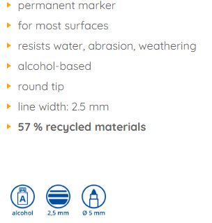pysyvä merkki@2useimmille pinnoille@2kestää vettä, hankausta, säänkestoa@2alkoholipohjainen@2pyöreä kärki@2viivan leveys: 2,5 mm@257 % kierrätettyjä materiaaleja