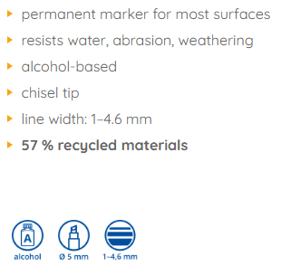 перманентный маркер для большинства поверхностей@2устойчив к воде, истиранию, атмосферным воздействиям@2на основе спирта@2острый наконечник@2ширина линии: 1–4,6 мм@257 % переработанных материалов