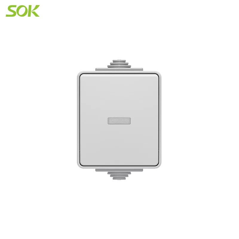 Yksinapainen kytkin LED-merkkivalolla. 10A - 250V. IP55. Harmaa.